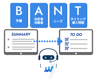 商談中にテキスト化した内容を自動で要約し、ToDo情報を抽出。予算や導入予定時期といった重要な商談情報(BANT情報)も整理でき、次回の商談にスムーズにつなげられます。