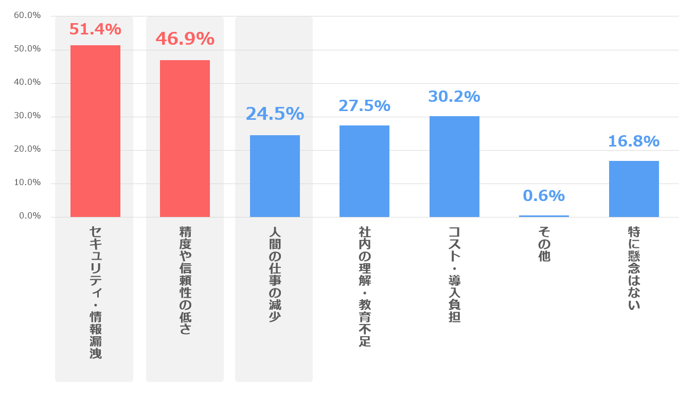 AI導入にあたり、最も多かった懸念はセキュリティ・情報漏洩(51.4%)。次いで精度・信頼性の低さ(46.9%)が続き、AIの品質に対する不安も根強いことがわかります。