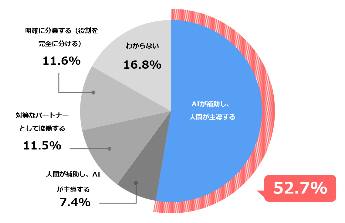 調査では、AIとの理想的な関係性について最も多かった回答が 「AIが補助し、人間が主導する(52.7%)」 でした。この結果は、企業も個人も「AIに置き換えられる未来」ではなく、人が主導し、AIが支える未来を望んでいることを示しています。