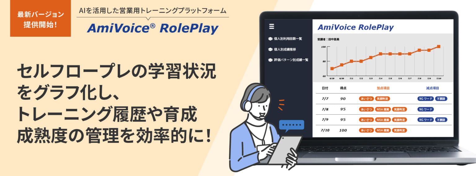 営業力強化ソリューション「AmiVoice SalesBoost(アミボイスセールスブースト)」にて提供している「AmiVoice RolePlay」は、営業力向上を目指すロールプレイングをサポートするクラウドサービスです。本サービスは、上司や先輩、トレーナーの時間を取らずに繰り返しロールプレイングができるセルフトレーニング機能を搭載しています。また、営業トークの内容や話速、表情などをもとに自動で定量評価を行う採点機能も備えており、効率的かつ効果的に営業メンバーの育成と営業力の向上を支援します。